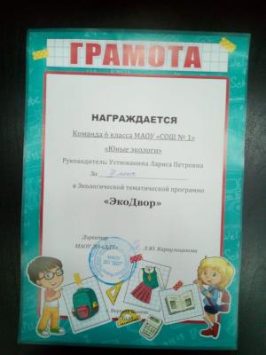 16 октября 6б класс под руководством Устюжаниной Ларисы Петровны занял 3 место в городском конкурсе Мой двор - моя забота, в рамках Областного фестиваля Я люблю природу, который проводился в городском ДДТ. Цель конкурса - воспитание бережного отношения к природе, вовлечение обучающихся в общественно-значимую деятельность, создание эстетической привлекательности территории своего двора. На конкурсе царила доброжелательная атмосфера, ребята научились премудростям работы на земле, дизайнерскому мастерству преобразования придомовой территории. Молодцы! Поздравляем!